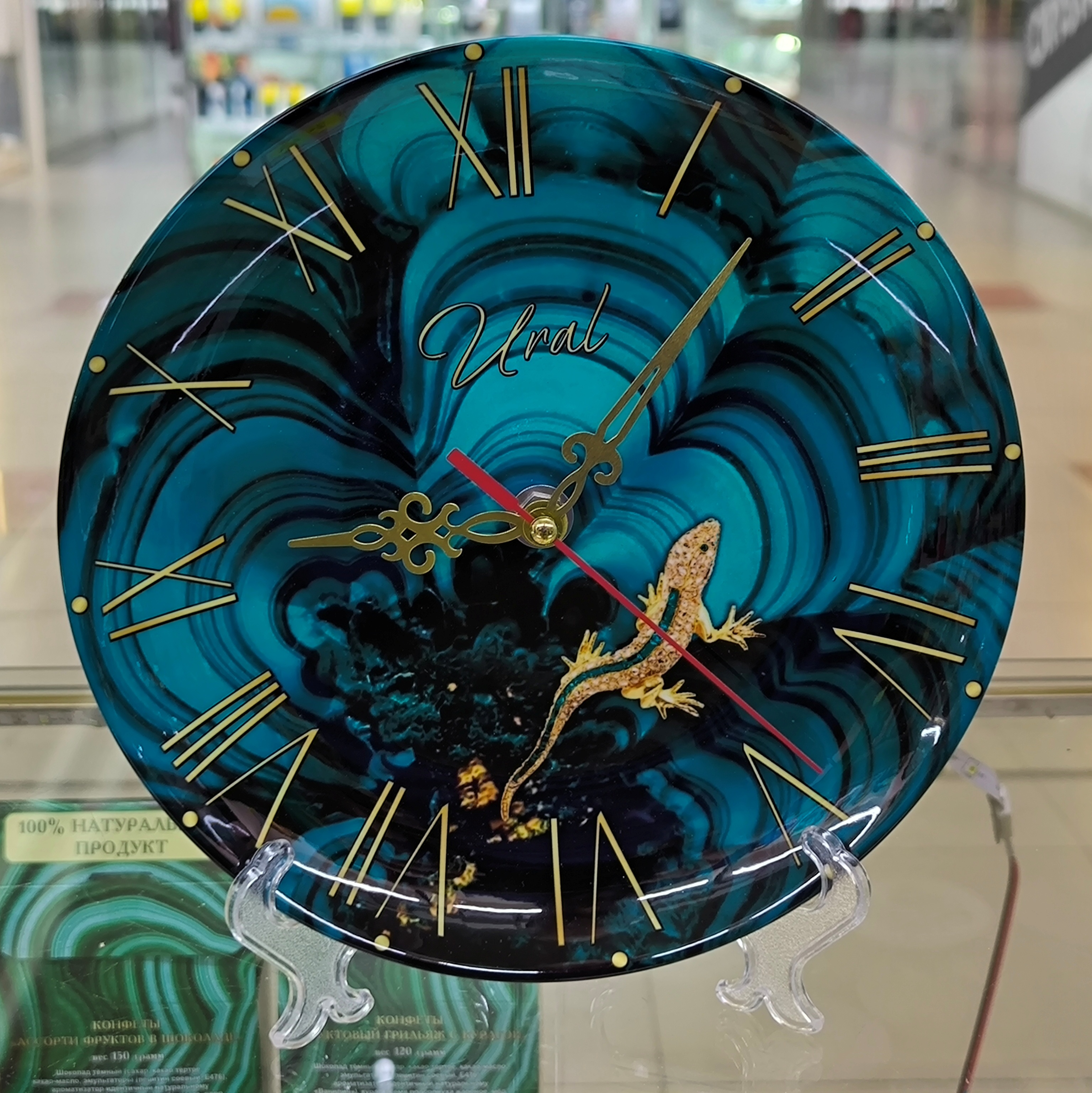 Яркие стильные часы с уральскими минерами и самоцветами прекрасно впишутся в интерьер. Прекрасно подойдет в качестве статусного подарка начальнику, коллеге. Купить Урал часы с малахитовым фоном и изображением ящерицы на нем можно в магазине Особый Случай.