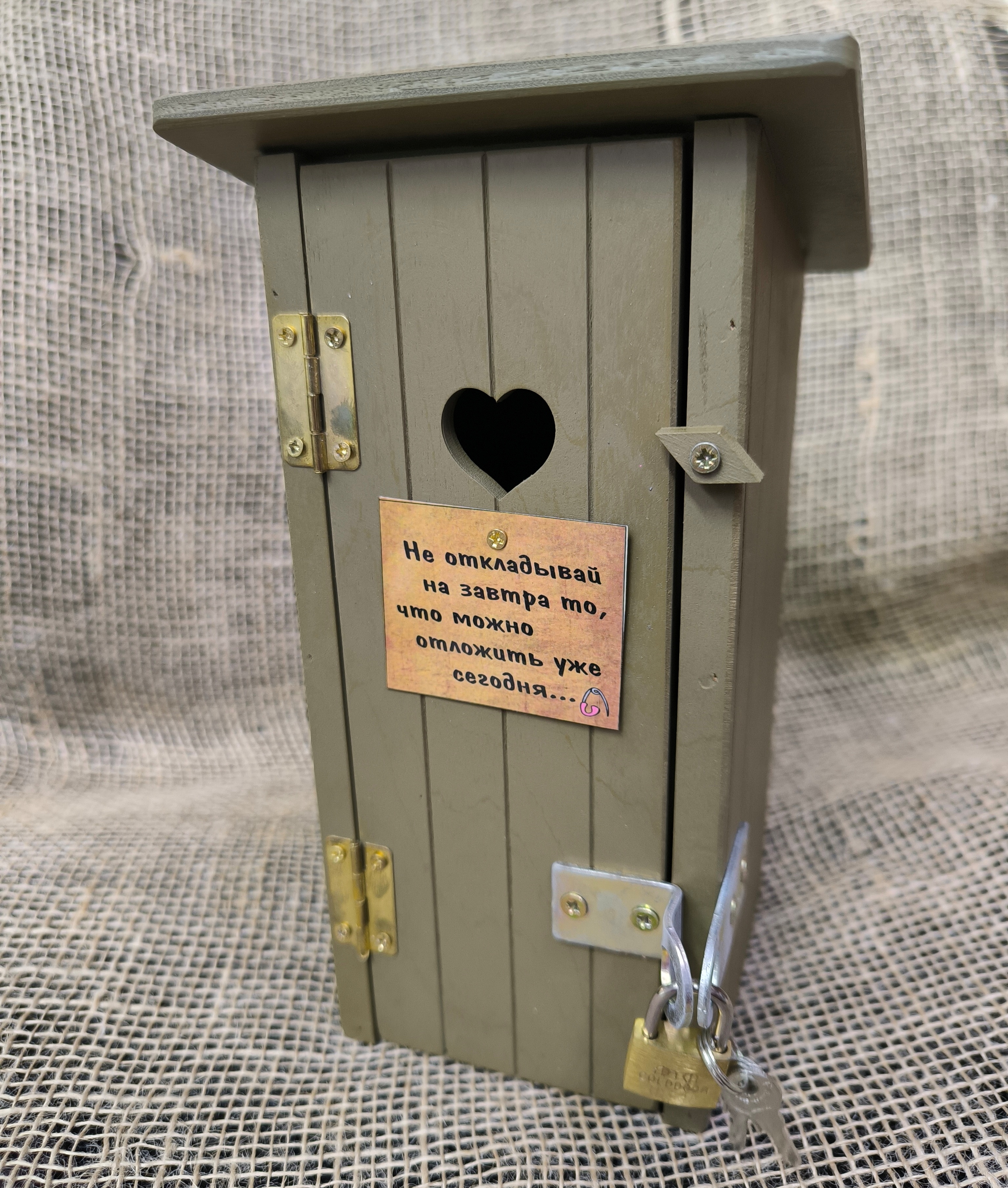 Креативный сувенир копилка в форме деревенского туалета "Не откладывай на завтра то, что можно отложить уже сегодня" из дерева.