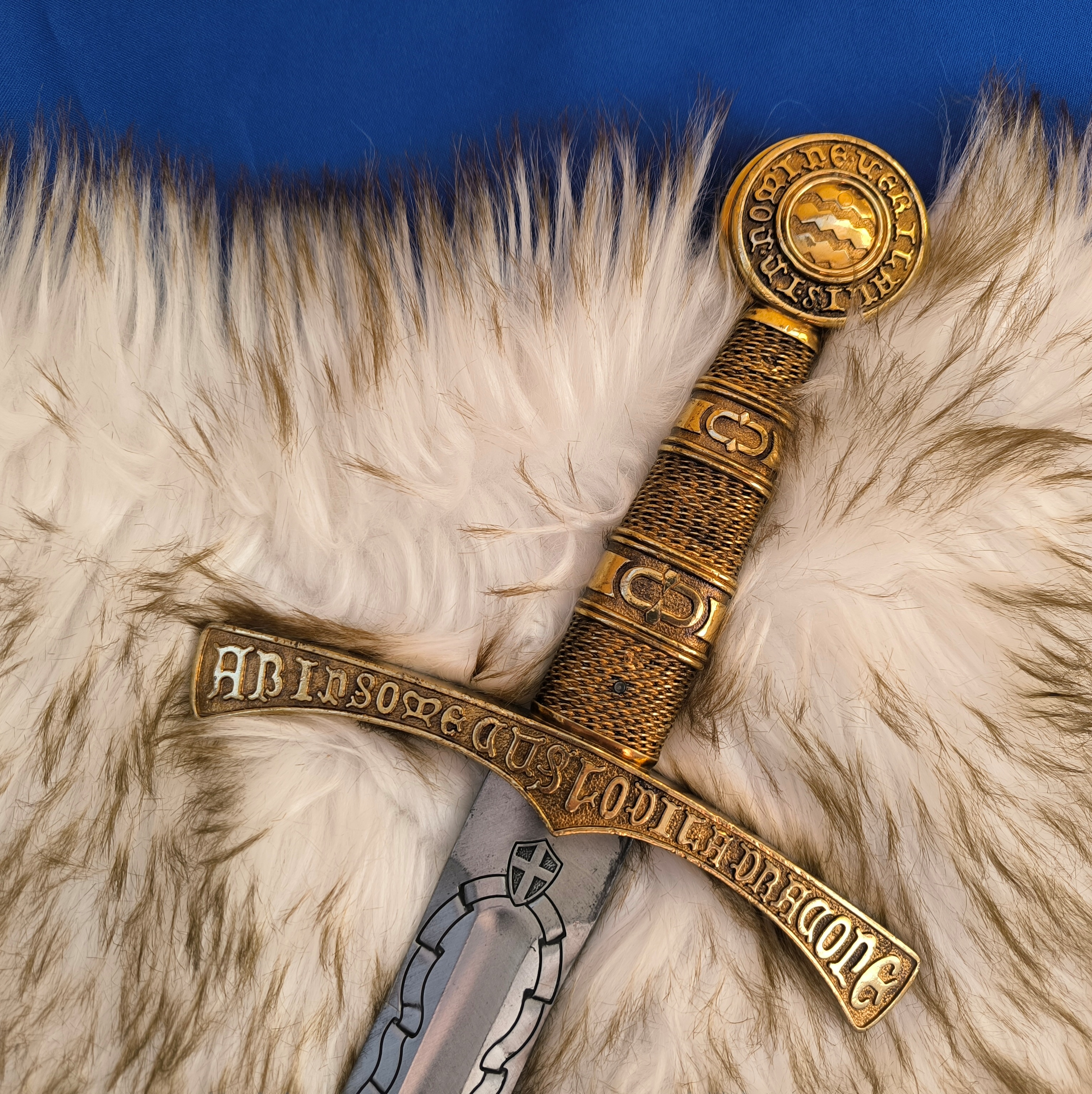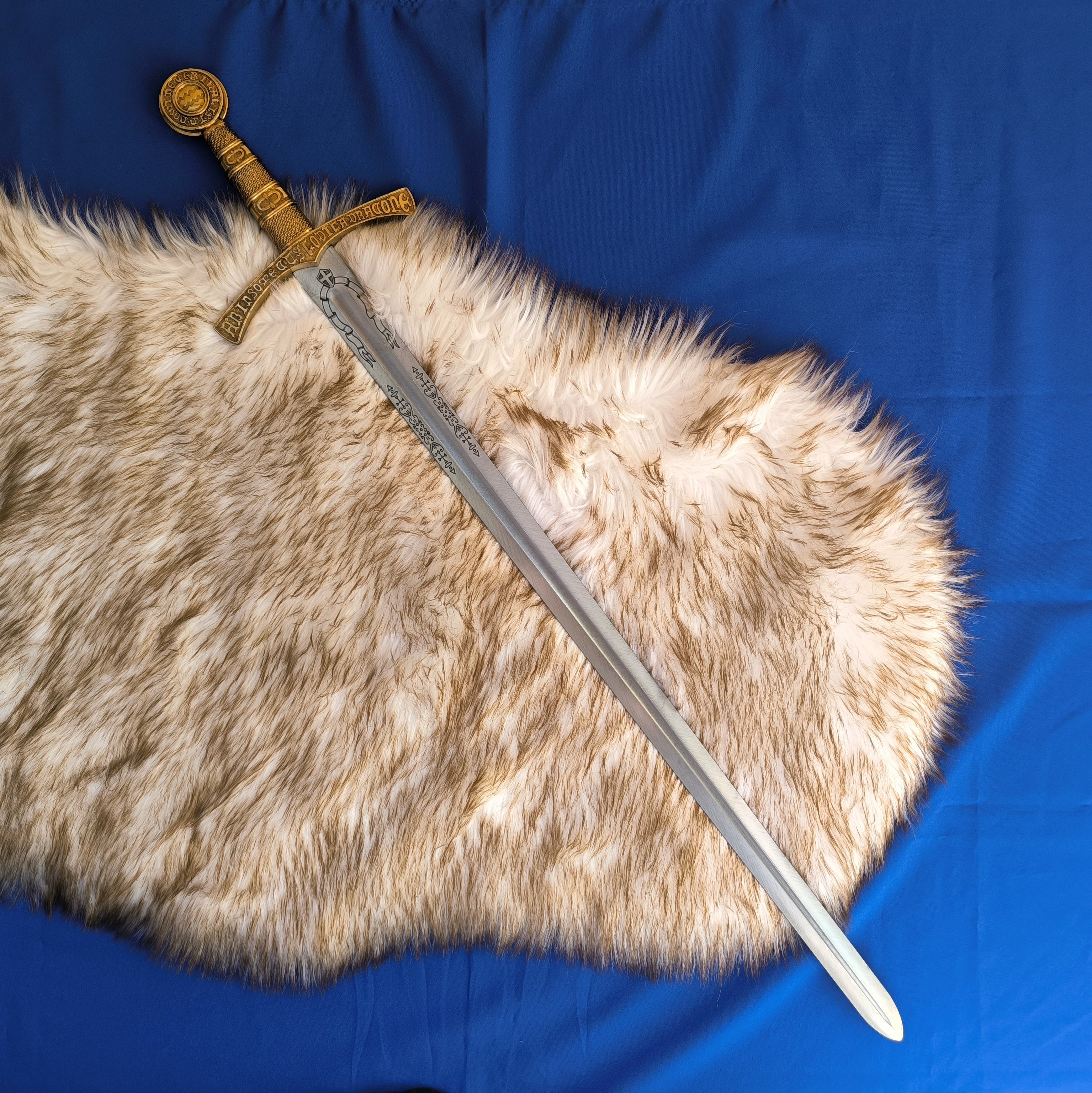 На крестовине и рукояти меча выгравирована надпись на латыни: «Охраняется Драгуном, который не спит, во имя правды». Лезвие украшено изысканными гравировками, что придаёт изделию аутентичный и благородный вид. Меч изготовлен с вниманием к историческим деталям и станет достойным украшением любой коллекции.