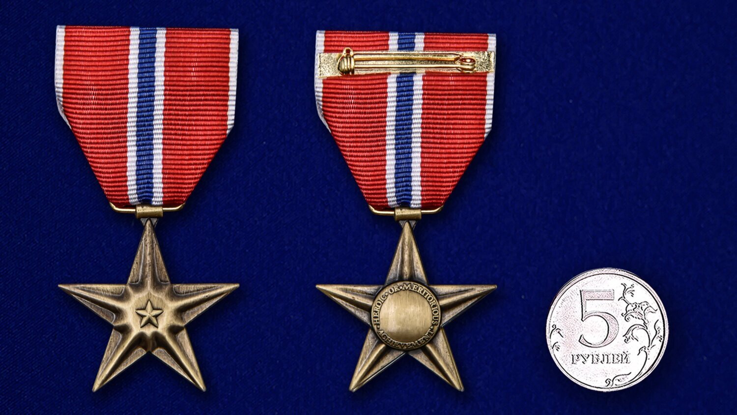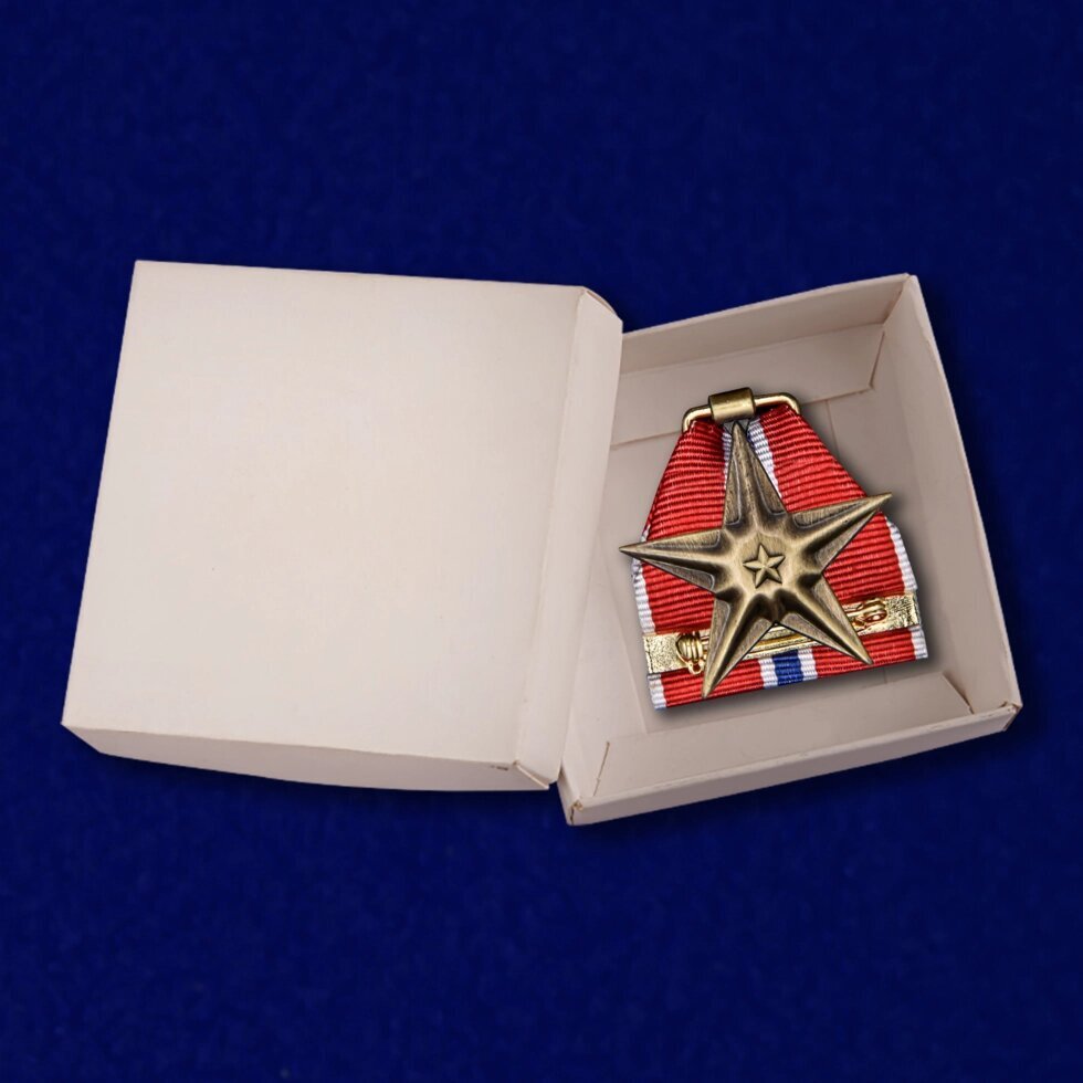 Уникальная возможность купить реплики наград государств – членов антигитлеровской коалиции! В частности, здесь представлена «Бронзовая звезда» США, изготовленная из латуни. Лента – муаровая, крепление - на булавочном зажиме.