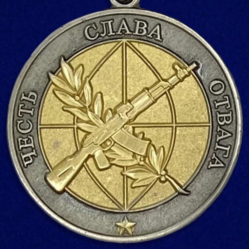Для изготовления используются латунные заготовки 32-миллиметрового диаметра с цельноштампованным ушком закругленного типа. На аверсе располагается стилизованный Земной шар, поверх которого нанесены автомат Калашникова и лавровая веточка, расположенные крест-накрест. По окружности располагается надпись «Честь Слава Отвага», а в самом низу по осевой линии присутствует 5-конечная звезда.