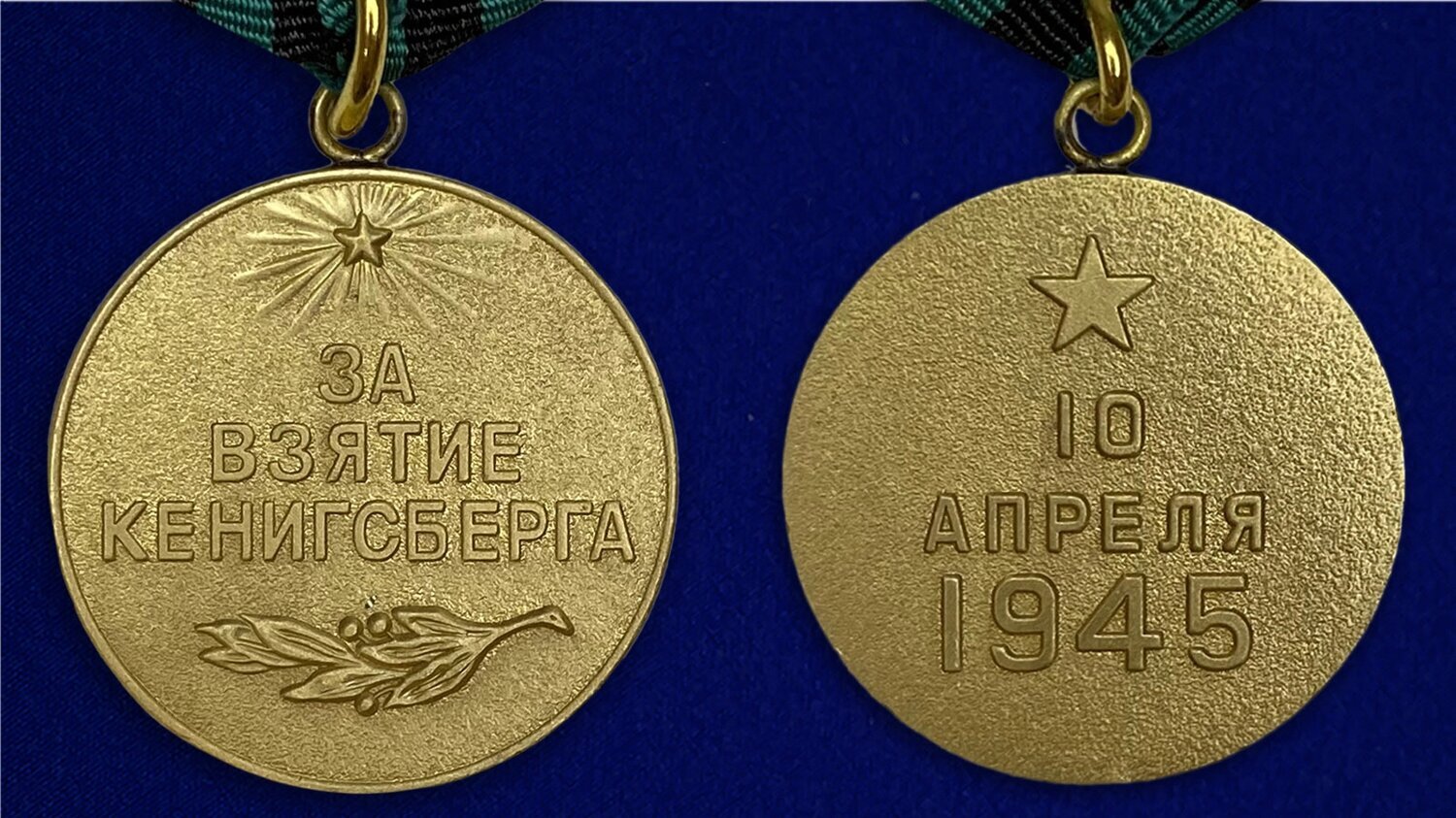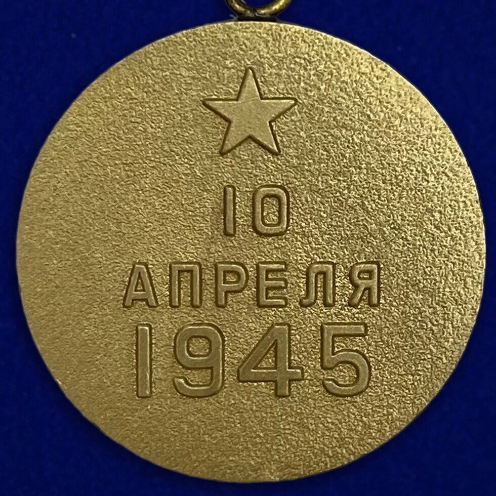 Обратная сторона – реверс награды, также оформлена пятиконечной звездой, но большего размера и без расходящихся лучей. Решив заказать медаль За взятие Кенигсберга, с обратной стороны можно увидеть дату – 10 апреля 1945. Эта дата – время, когда прошла успешная военная операция по взятию города-крепости. Она размещена в центре награды и написана также заглавными буквами.