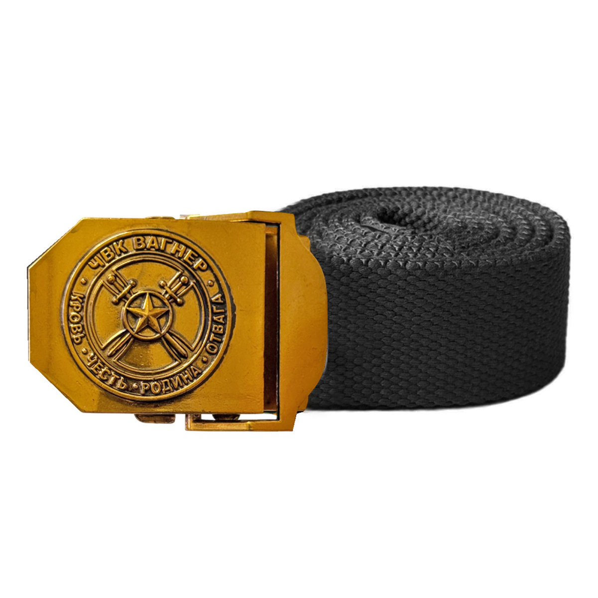 Мужской текстильный ремень ЧВК Вагнер со стальной пряжкой. Пряжка декорирована объемным принтом с тематической символикой.