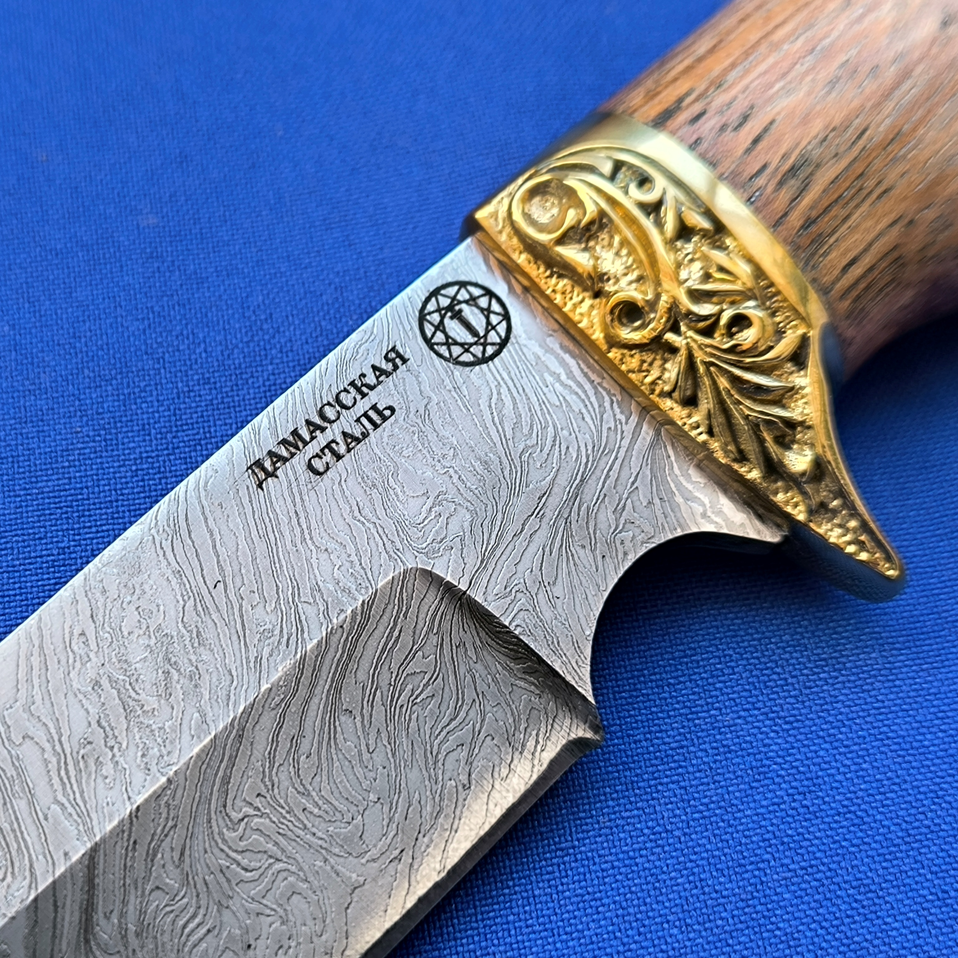Длинный клинок, благодаря чуть приподнятой линии обуха и удлинённой режущей кромке, обладает отличным качеством реза. Сталь, из которой выполнен клинок, это настоящая дамаска, воспетая во множестве легенд. Её поверхность покрыта оригинальным естественным узором, который получается путём перековывания в единый монолит нескольких сортов металлов с различными показателями твёрдости. В результате правильной обработки на свет появляется сталь с уникальными характеристиками – высочайшей прочностью, отличной упругостью и необычайной остротой и устойчивостью режущей кромки.