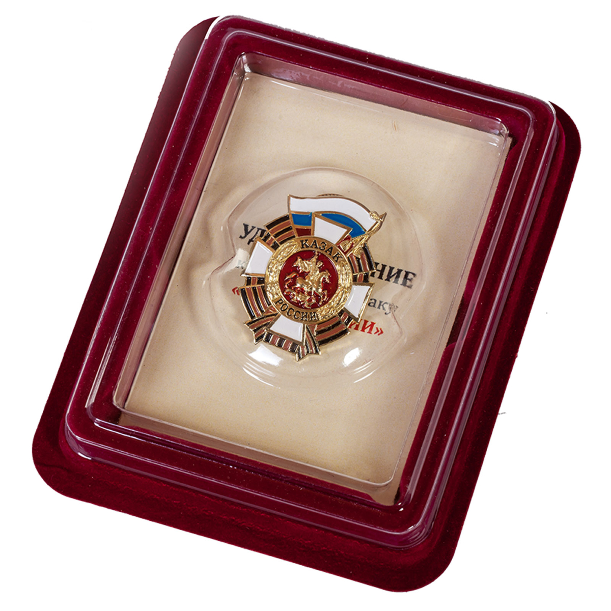 Нагрудный знак "Казак России" в футляре из флока с пластиковой крышкой