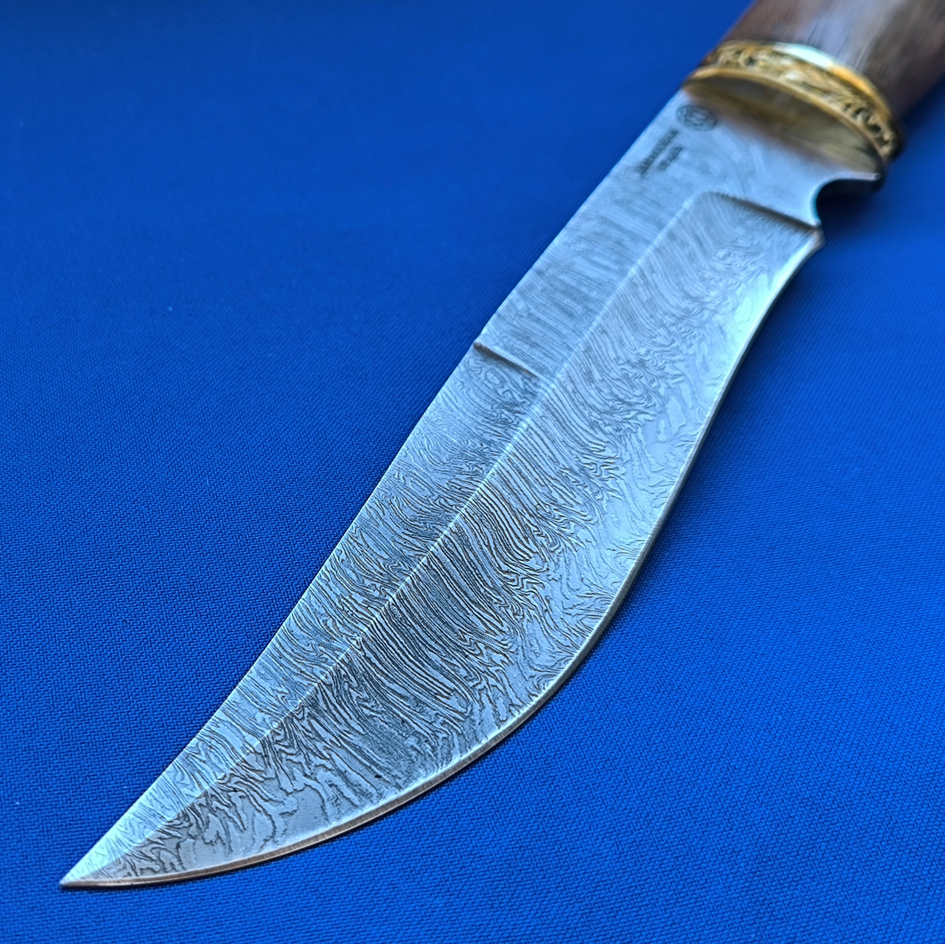 Нож Князь Дамаск - это достаточно крупная модель с особой формой клинка, примерно на середине обуха которого имеется скос в форме вогнутой дуги. Острие клинка при этом направлено немного вверх. Клинки такой формы именуют в просторечьи щучкой. Профессионалы же называют такую геометрию боуи или клип-пойнт. Вогнутая часть обуха имеет фальшлезвие, а режущая кромка выполнена в форме буквы S. Подобное сочетание обеспечивает модели отличные проникающие и режущие качества.