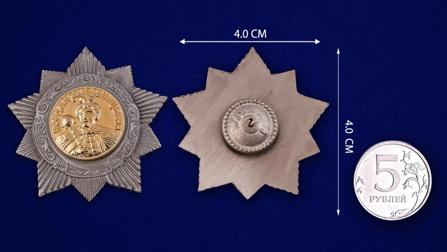 В центре – позолоченный медальон с портретом гетмана Богдана Хмельницкого, держащего булаву с круговой надписью «Богдан Хмельницький», ниже — скрещенные сабли, под медальоном – перекрещенные сабли. Пятиконечная звезда ордена изготавливалась из серебра, медальон – из золота. Это был единственный из советских орденов, который никогда не носили на подвесной колодке.