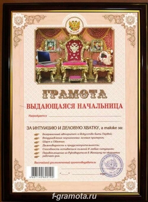 Шуточная грамота "Выдающаяся начальница" в почётной рамке.