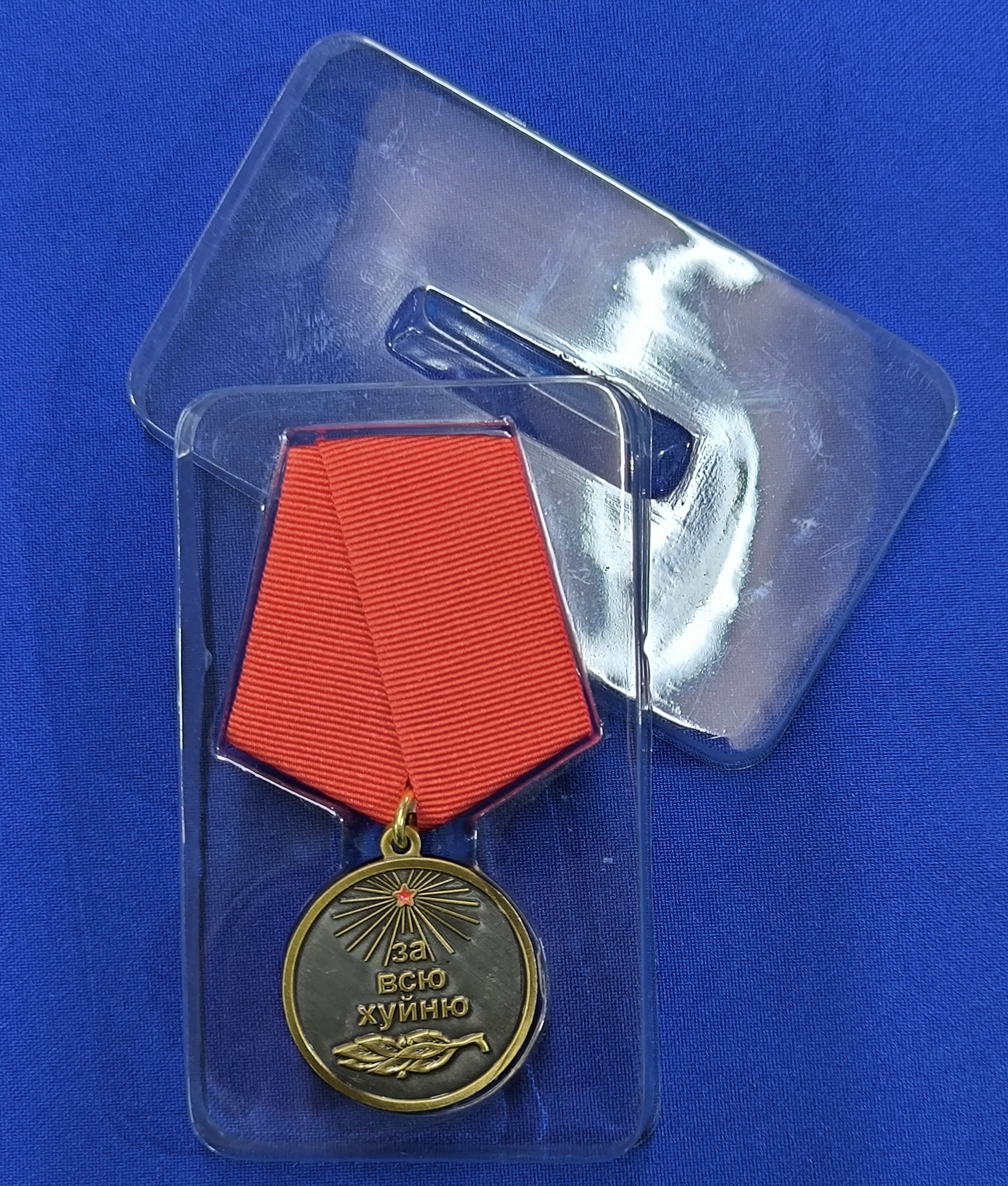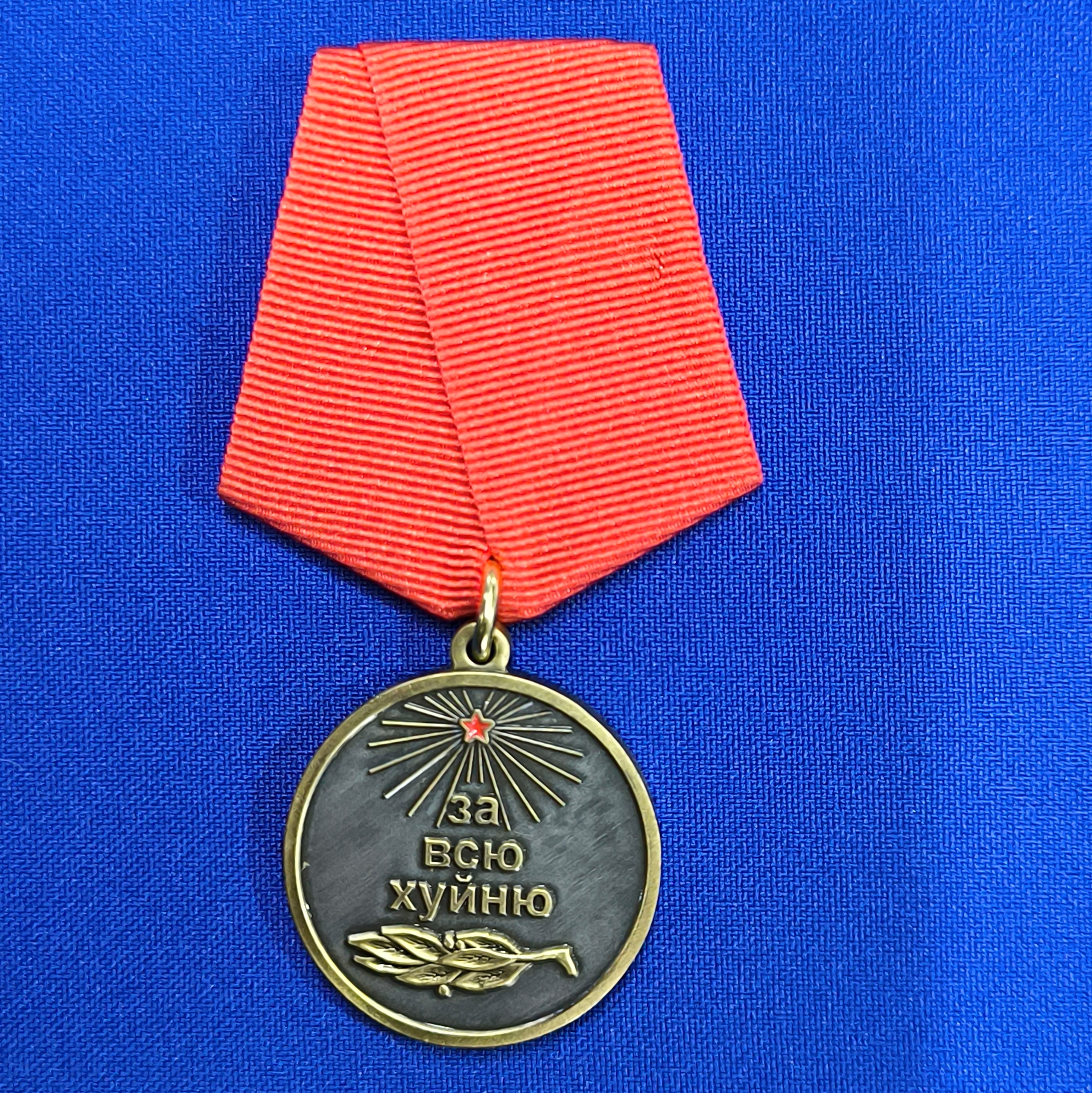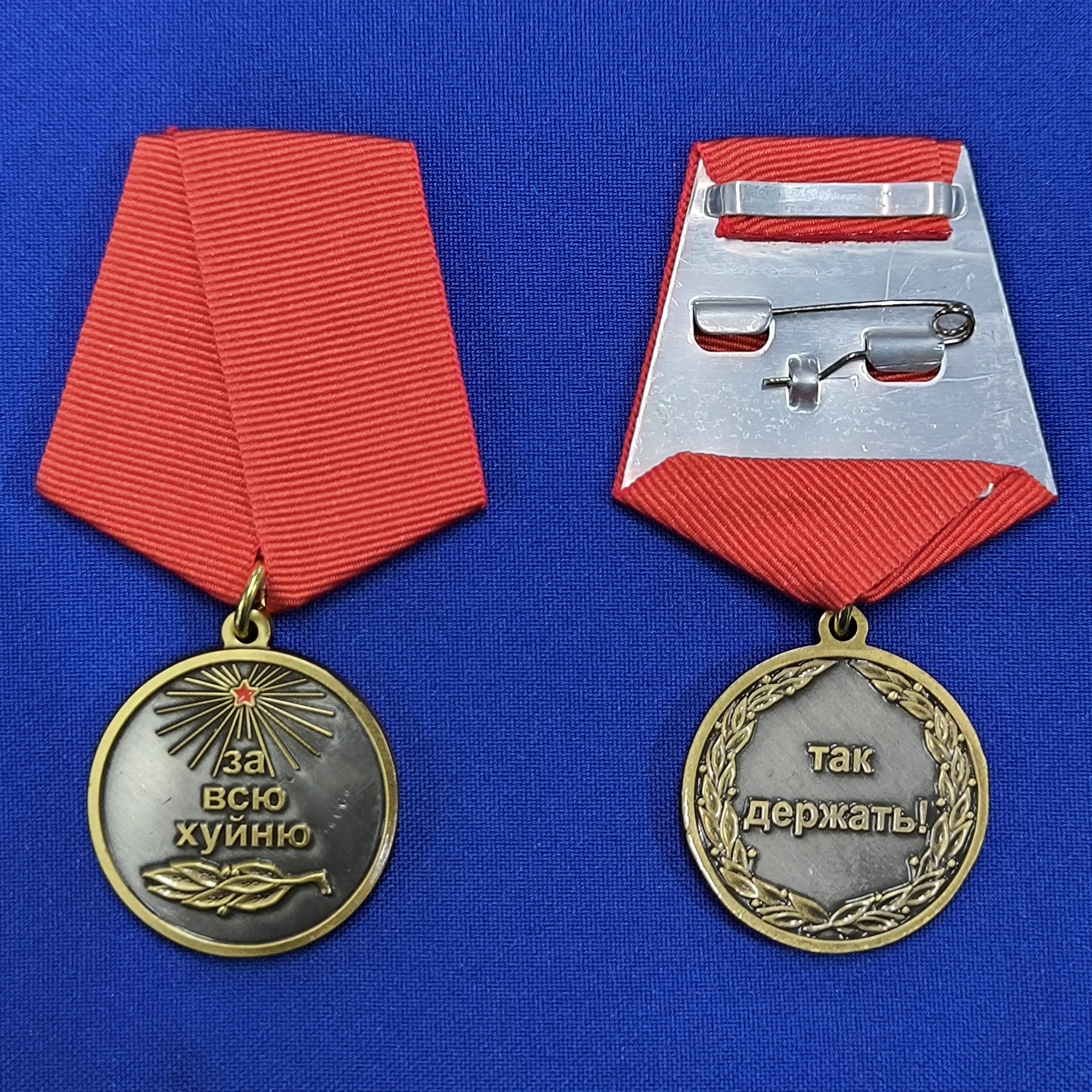 Медаль высокого качества выполнена из латуни с эмалевым покрытием. На аверсе медали изображена красная звезда с исходящими от нее лучами, надпись "ЗА ВСЮ ХУЙНЮ", под надписью расположена лавровая ветвь. На реверсе изображен венок, в центре которого надпись "ТАК ДЕРЖАТЬ!". Колодка четырехугольная с булавочным зажимом. В комплекте с медалью идет незаполненный бланк удостоверения.