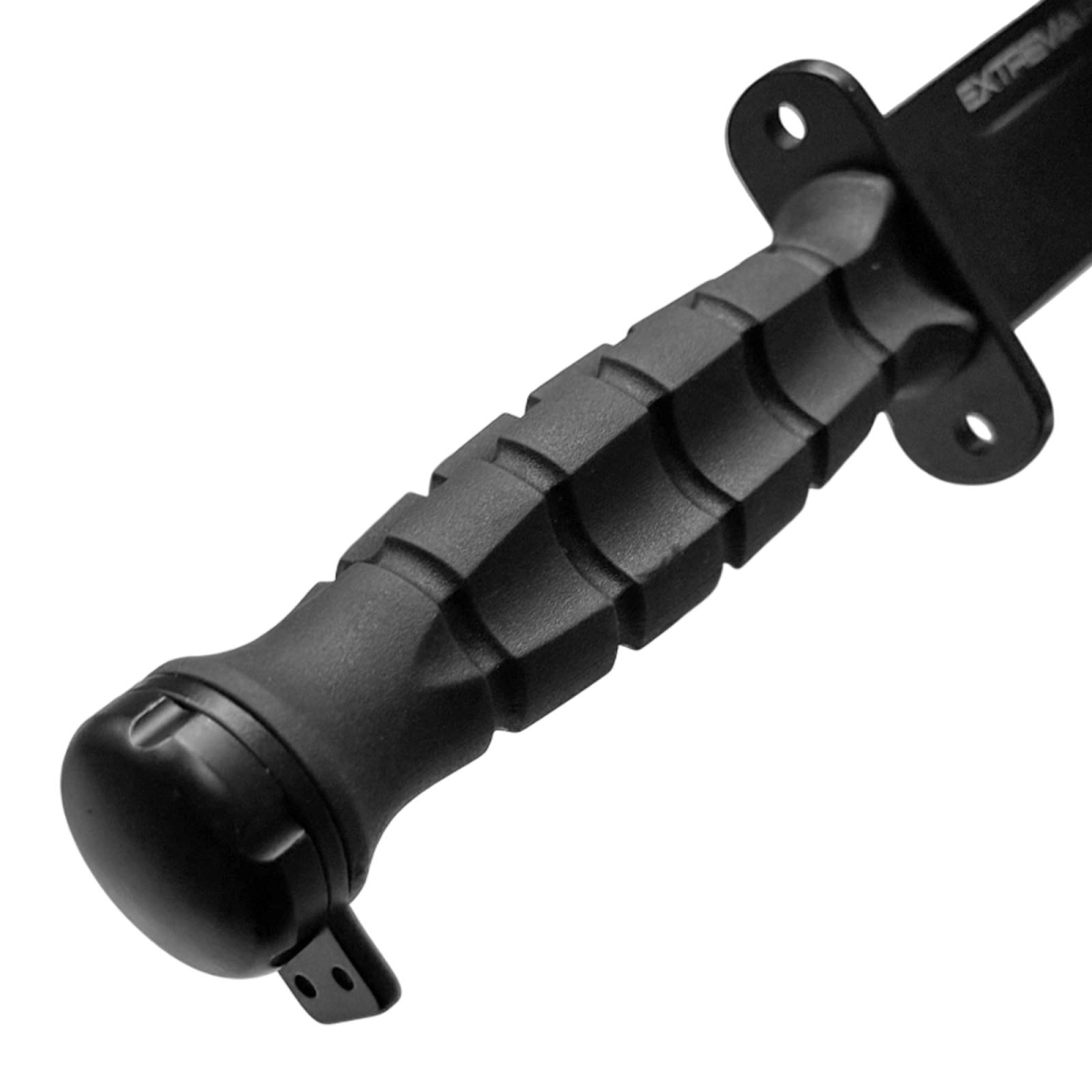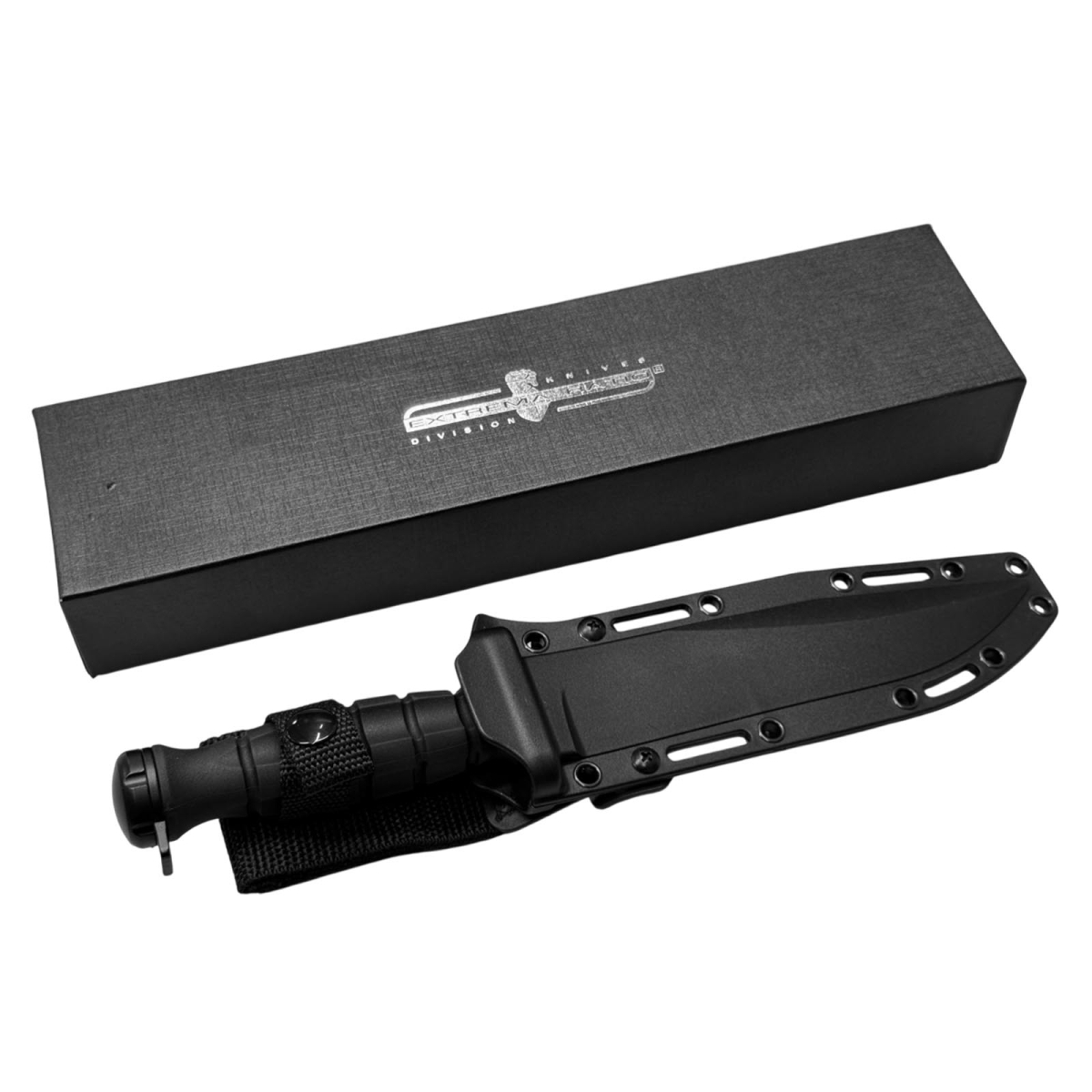На тыльной часки расположена съёмная ударная лапка с отверстием под темляк. Гарда предотвращает соскальзывание руки на кромку при колющих движениях. В комплекте поставляются прочные тактические ножны, совместимые с MOLLE.