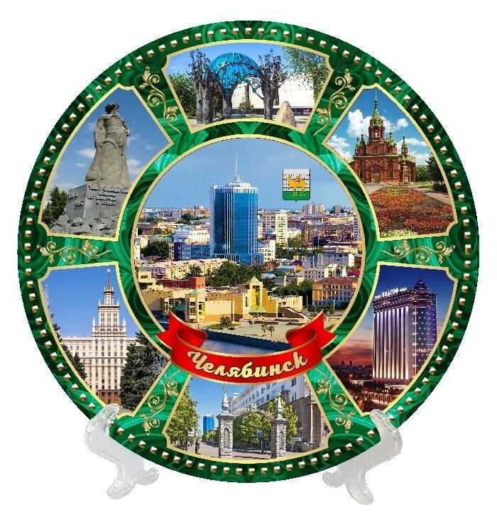 Тарелка керамическая сувенирная "Коллаж Набережная" диаметром 21 см. с достопримечательностями Челябинска. Изображение полноцветное. В комплекте индивидуальная коробка, подвес и пластиковая подставка. Изображение стойкое, поверхность глянцевая.