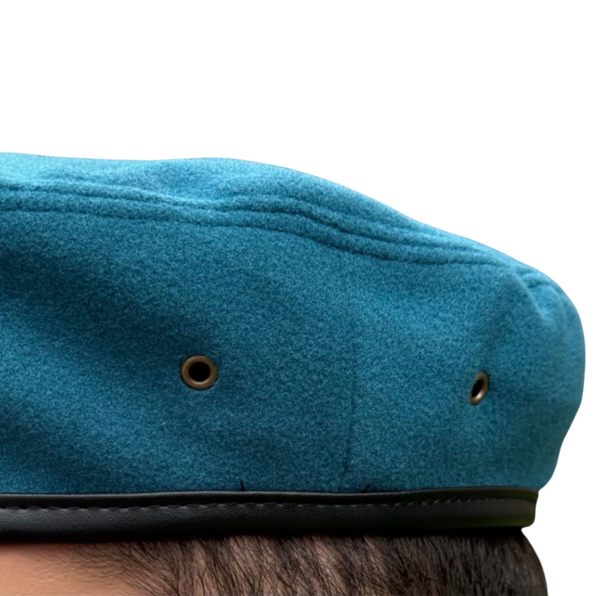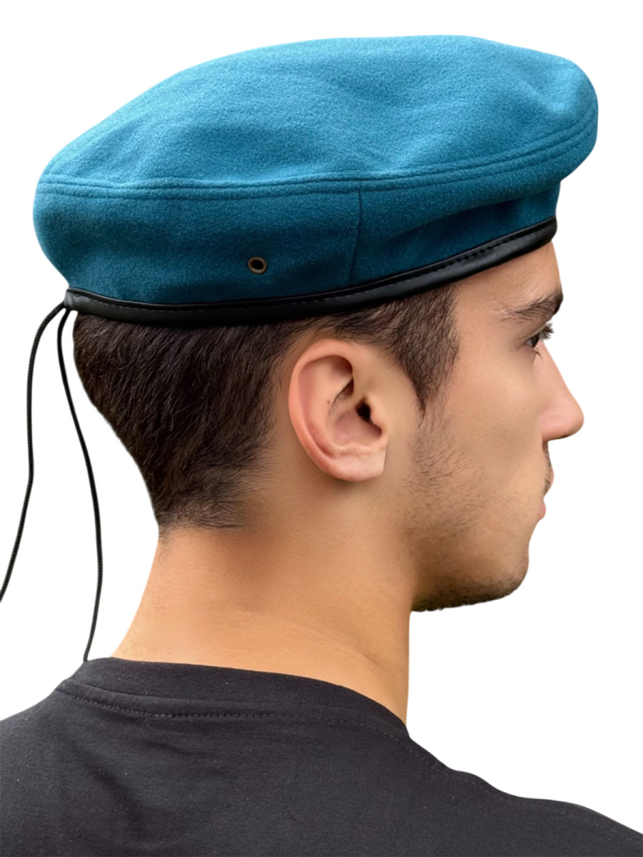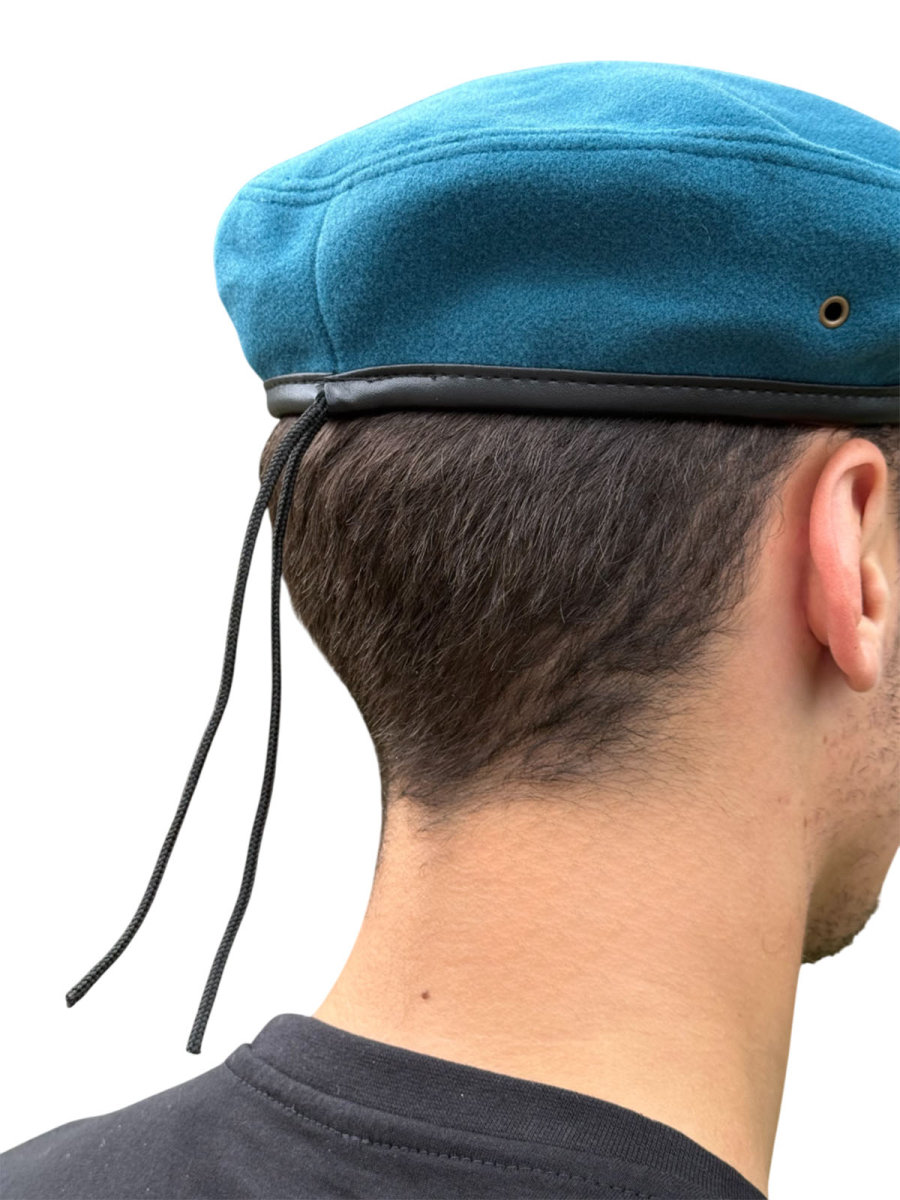 Голубой берет ВДВ не отбит, без знаков отличия (кокарда, эмблема, или уголок прикрепляется самостоятельно). Предусмотрены люверсы для вентиляции, по нижнему краю размещена кожаная окантовка с регулировочным шнуром.