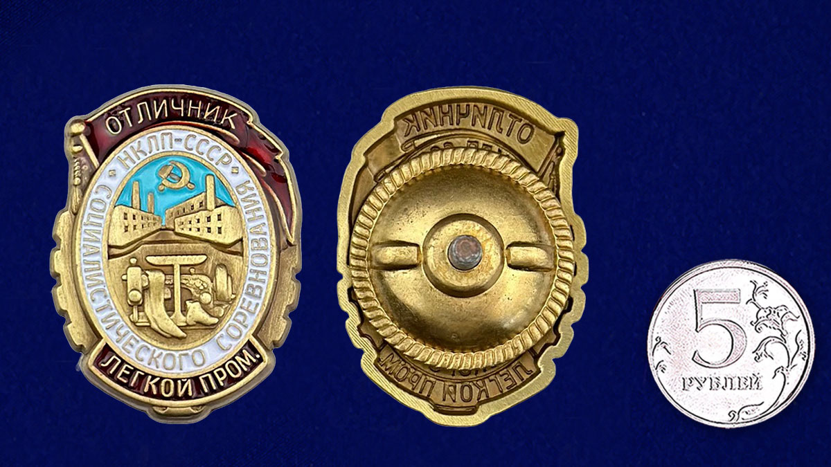 Имеет форму неправильного фигурного овала. В центре аверса позолоченные силуэты фабричных зданий, перед которыми также позолоченные изображения предметов продукции легкой промышленности - швейная машинка, обувь, трикотаж. За силуэтами фабричных зданий покрытое голубой эмалью небо с изображением серпа и молота.