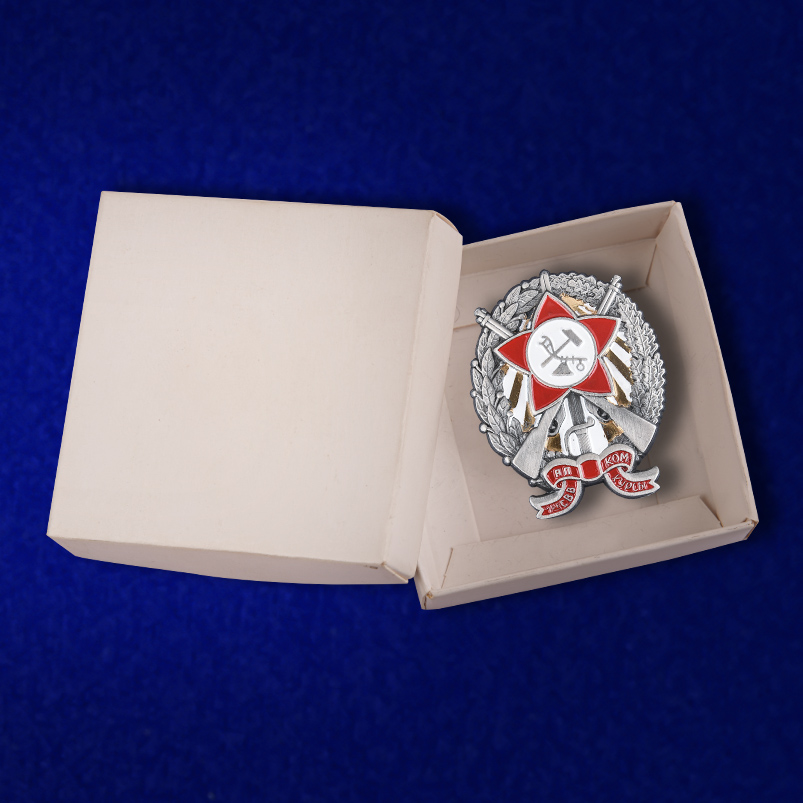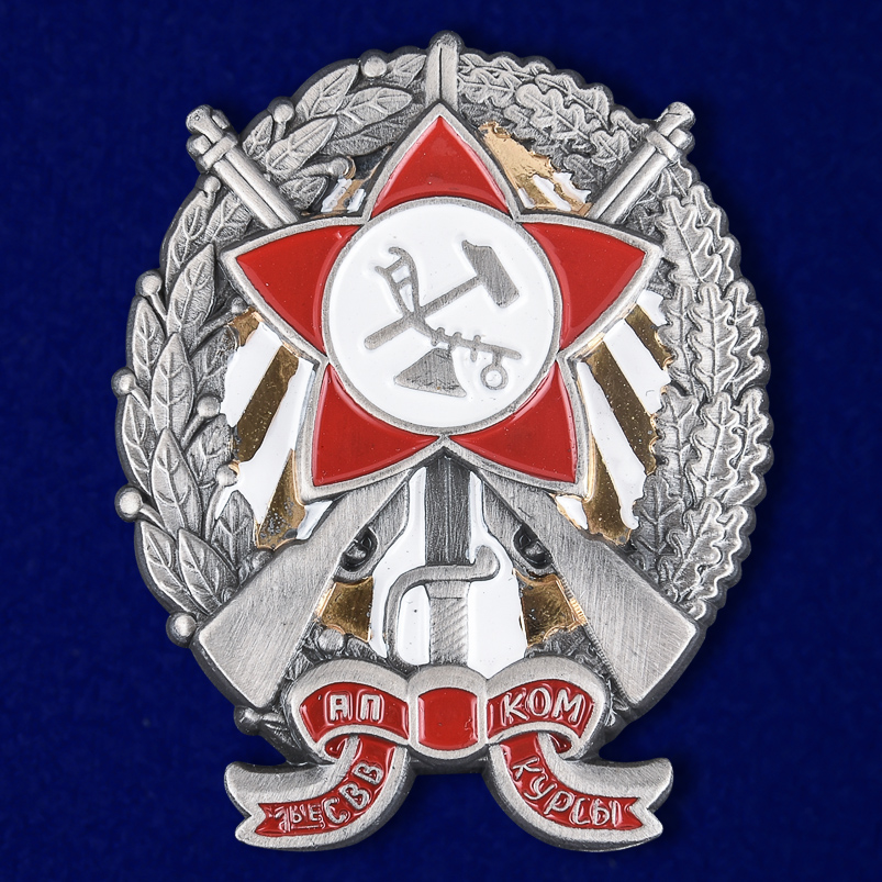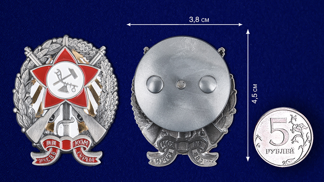 Знак Пехотных петроградских курсов командиров РККА. Материал изготовления - латунь, покрытие - гальваника и горячая эмаль. Крепление - на болте и гайке.
